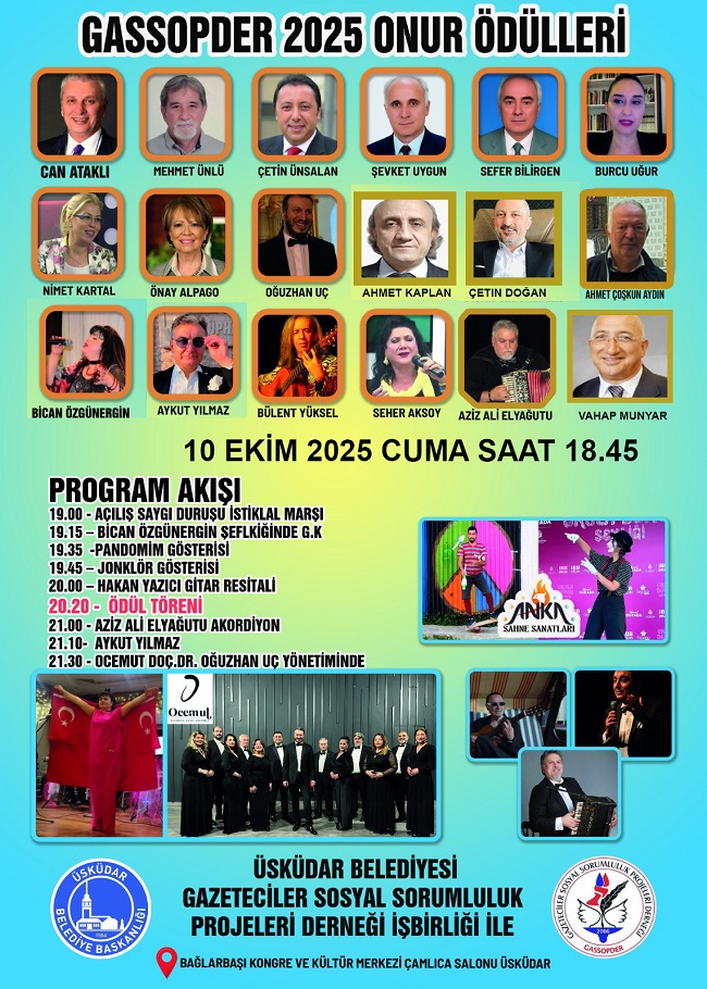 Gazeteciler Sosyal Sorumluluk Projeleri Derneği (GASSOPDER) tarafından düzenlenen 2025 Onur Ödülleri, 10 Ekim 2025 Cuma günü saat 18.45 da Üsküdar Bağlarbaşı Kongre ve Kültür Merkezi’nde gerçekleştirilecek.